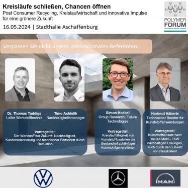 Teilnehmende profitieren von praxisnahen Vorträgen führender Experten zu Themen wie Metallersatz, High-Performance-Polymeren, Kreislaufwirtschaft und Recycling. Sie erhalten gezielte Impulse, um Materialien, Anwendungen und Prozesse im eigenen Unternehmen weiterzuentwickeln.